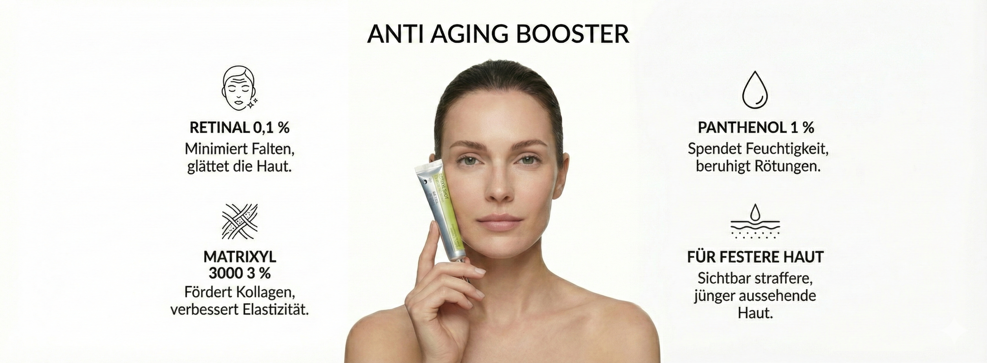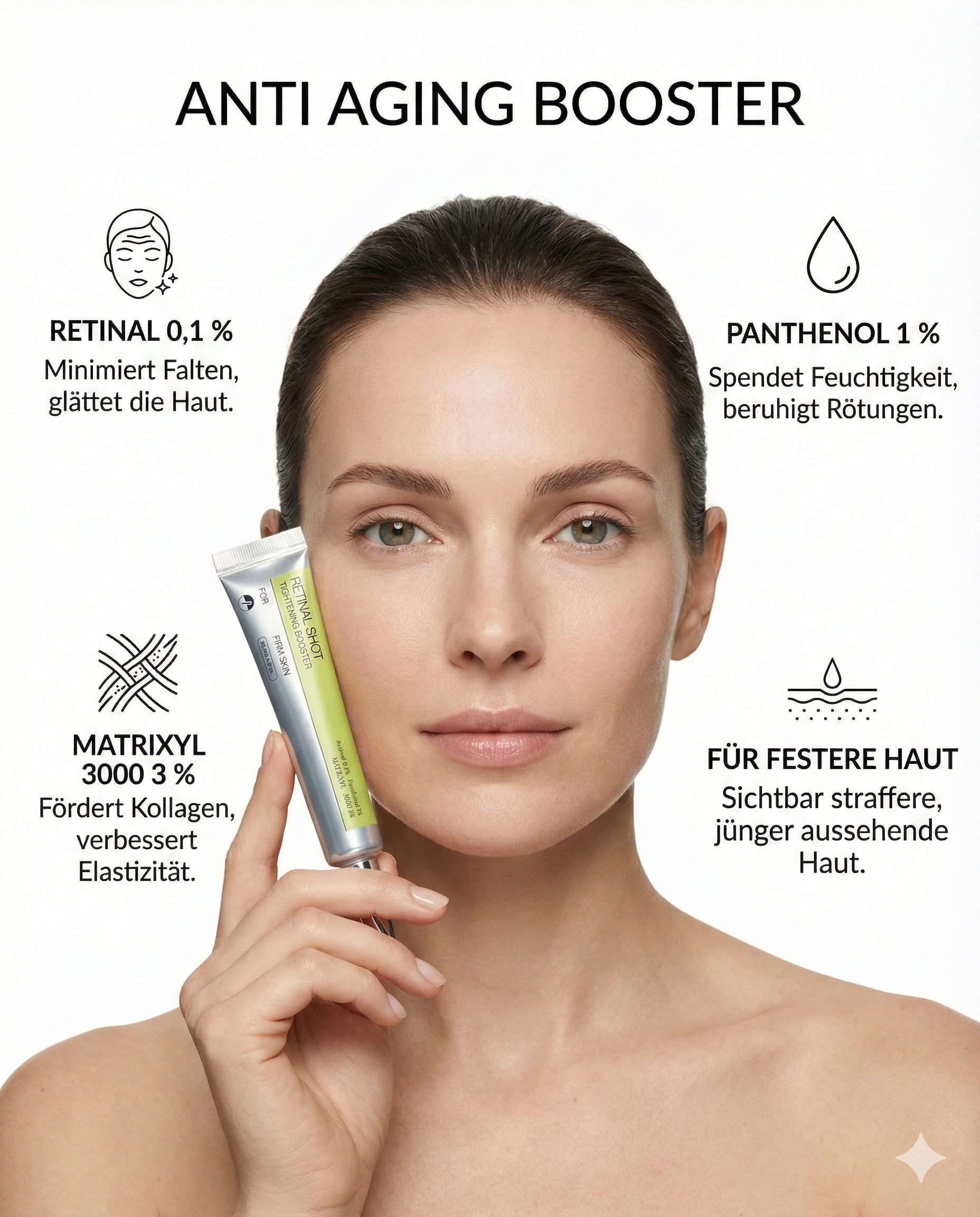 Im Zentrum der Formulierung steht Retinal, eine besonders effiziente Vitamin-A-Form, die im Vergleich zu klassischem Retinol gezielter wirkt und häufig besser vertragen wird.